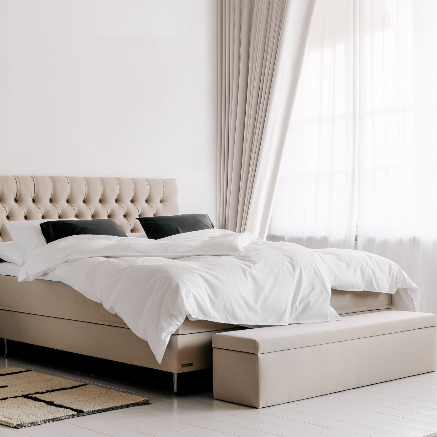 Hintaesimerkki sisältää 80 cm leveän Legenda-moottorisängyn Sand-kankaalla, tammijalat, langattoman säätimen ja Skanner-petauspatjan.