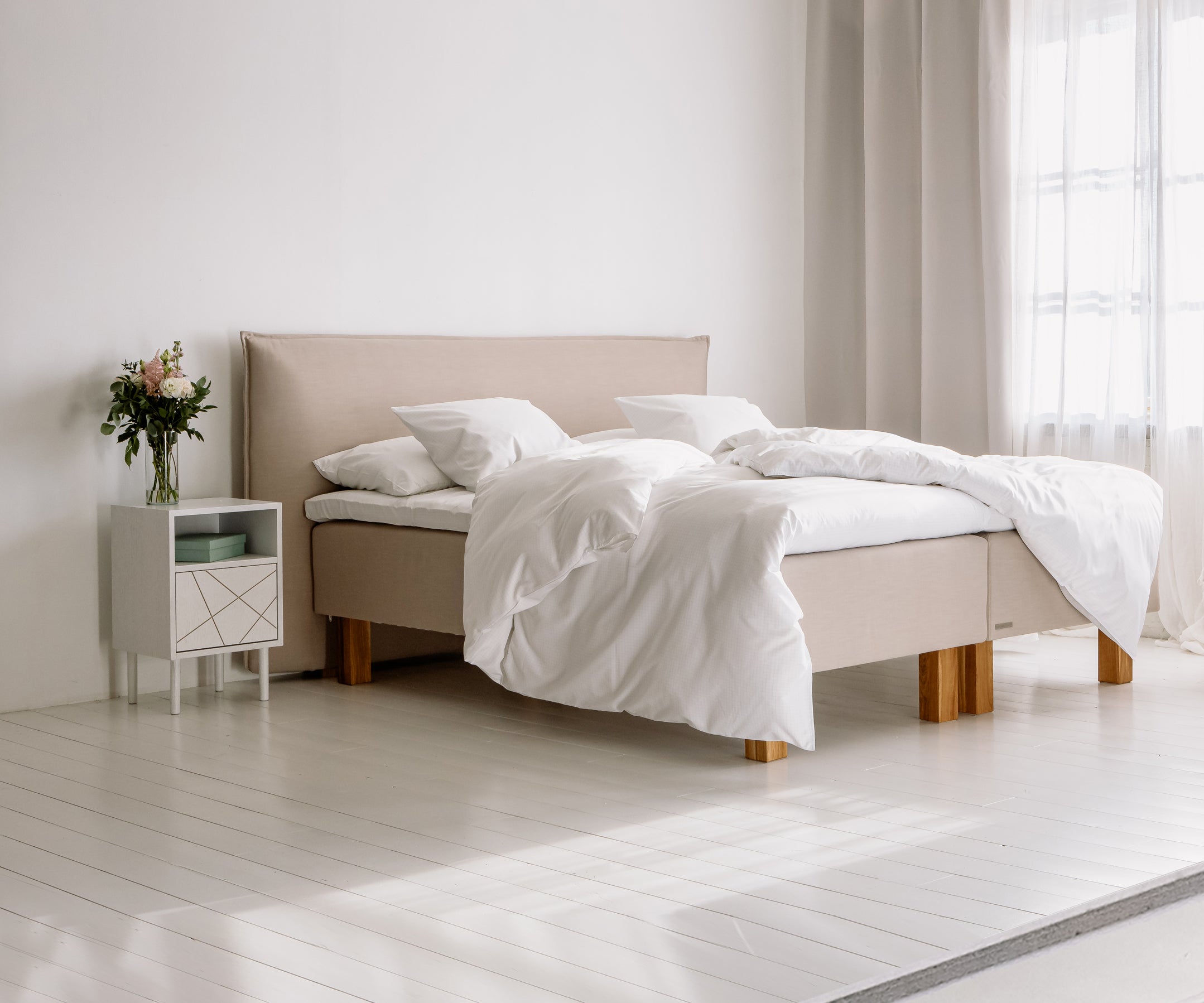 Sängyn verhoilun, jalat ja päädyn voit valita laajasta valikoistamme.