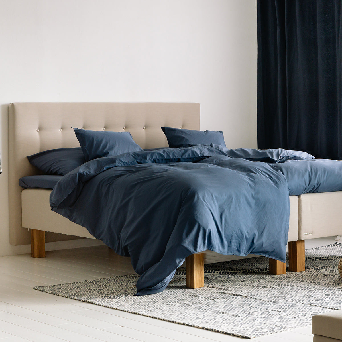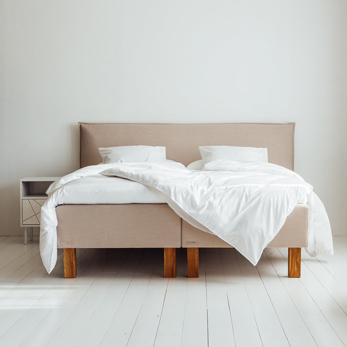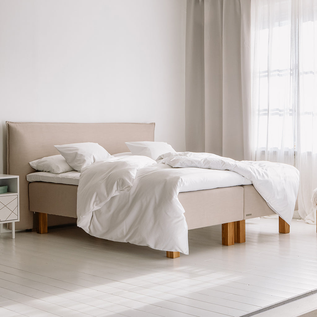 Sängyn verhoilun, jalat ja päädyn voit valita laajasta valikoistamme.